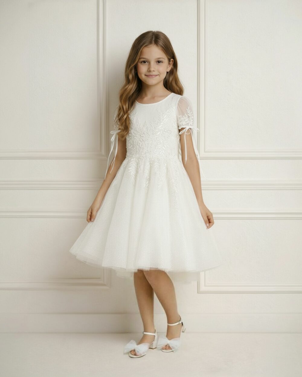 De blote rug is afgewerkt met fijne knoopjes en vormt een mooi contrast met de zachte pofmouwen, die zijn voorzien van lieve strikjes. De zwierige tule rok met glitters valt soepel en is aan de achterkant iets langer, wat zorgt voor een sierlijk en elegant silhouet.