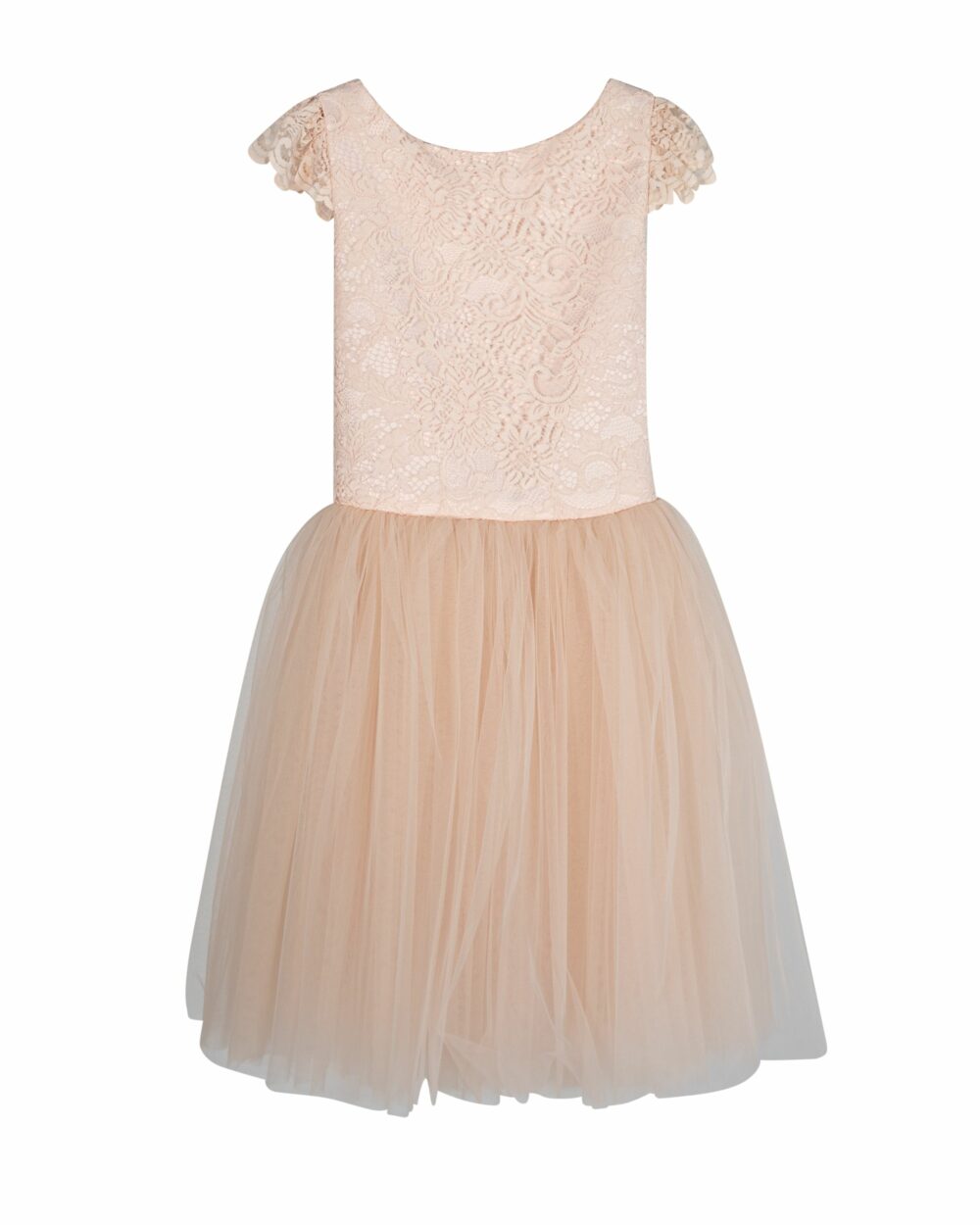 Bruidsmeisjes jurk met vetersluiting met satijnlint op de rug en wijde tule rok. Het lijfje van de jurk is gemaakt satijn met bruidskant erover. De gerimpelde kapmouwtjes van kant geven het jurkje een speels effect. Perfect voor een bruidsmeisje of voor een communie.