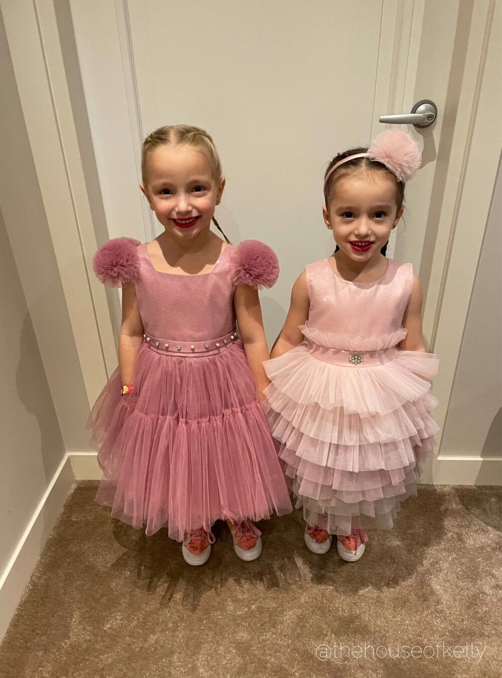 Roze feestjurk voor kinderen met laagjes tule die van lichtroze naar donkerorze lopen. In de taille zitten strass-steentjes. Grote tule strik aan de achterkant. Inclusief roze haarband.