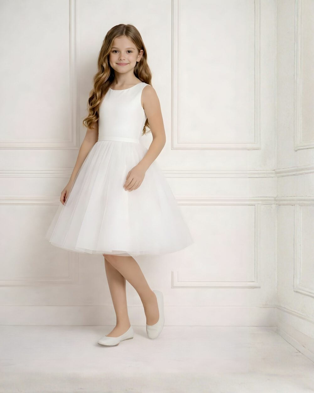 De rok bestaat uit 6 lagen zachte tule, wat zorgt voor veel volume en een mooie, zwierige uitstraling zonder zwaar aan te voelen. De jurk valt op knielengte en beweegt prachtig mee, perfect voor bruidsmeisjes en bloemenmeisjes die zich vrij willen bewegen.