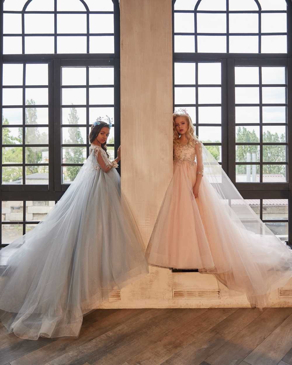 Mooie lange jurk van tule met sleep. Aan de voor- en achterkant zit kant. De rug en mouwen zijn doorschijnend.
