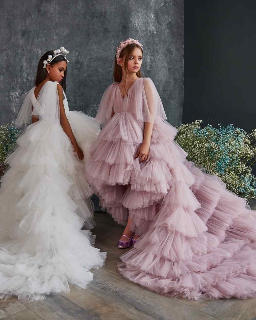 Prachtige jurk voor meisjes met lange sleep. De jurk heeft een lange tule rok in laagjes.