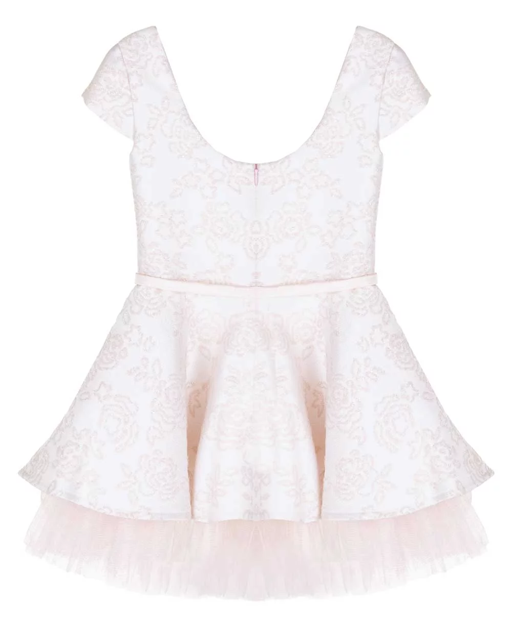 Is je dochter gek rondjes zwieren? Deze jurk is daar perfect voor! De jurk is gemaakt van luxe brokaat stof met zilverdraad. In de taille zit een smal riempje met strikje. De jurk heeft kapmouwtjes.
