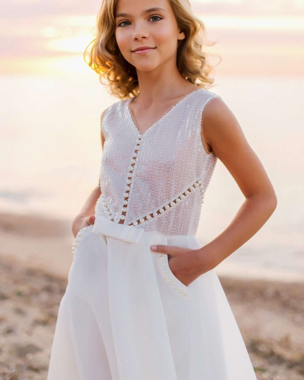 Mouwloos jurkje met glitters en parels. De jurk heeft zakken en een strikje.