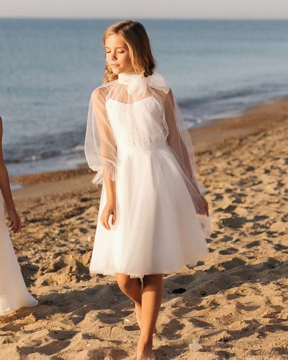 Tule jurk voor meisjes met lange mouwen en strik in de hals. Mooi om te dragen tijden een communie of bruiloft (bruidsmeisje)