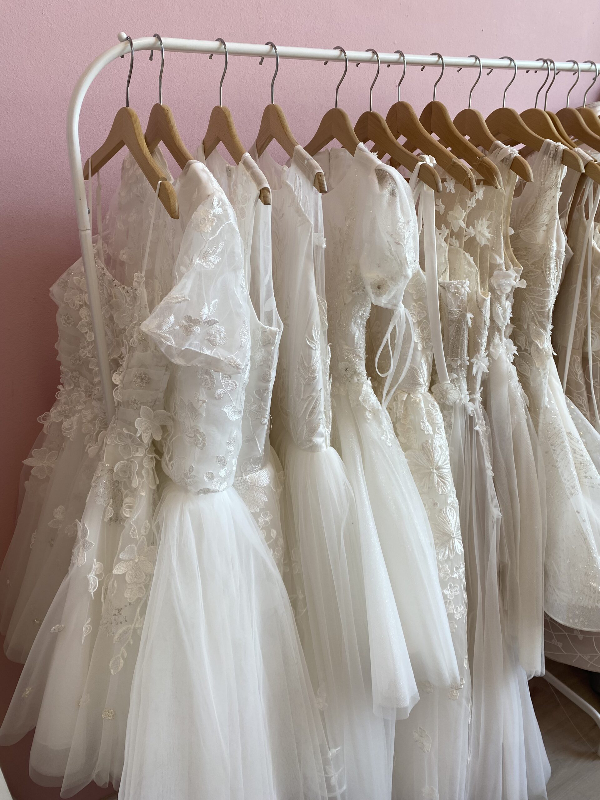 Er hangen verschillende stijlen jurken in de winkel, zoals modern, klassiek, bohemian, romantisch, over-de-top (lange jurken met speel en veel handwerk) en stoere jurken.
